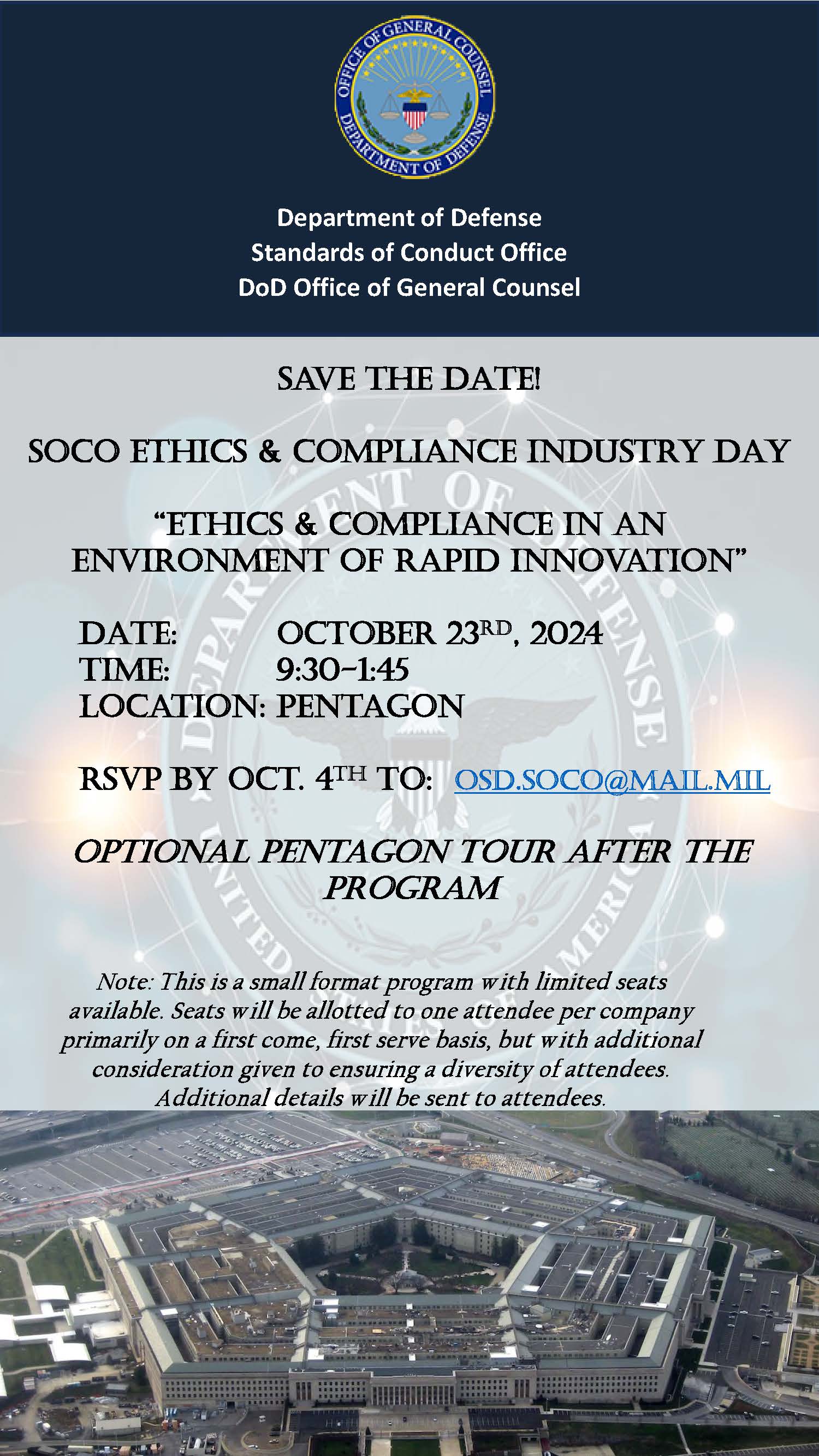 Limited seats are available. Please RSVP by October 4th to OSD.SOCO@MAIL.MIL